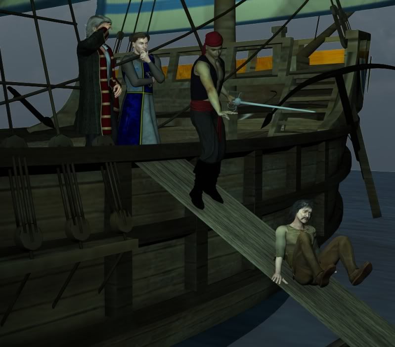 Benjamin brushes himself off after being ejected from the ship and walks off muttering to himself about being lucky he wasn't keelhauled. "Secretive bunch they are, too bad I didn't get anythin fer my trouble." With a shrug, he waves back at the ship and goes to find out if any rumors are circulating in the taverns.